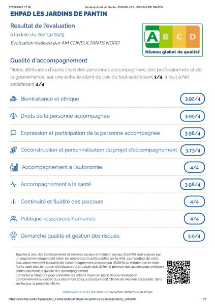 Comme vous le savez sans doute, la résidence Les Jardins de Pantin a fait l’objet d’une évaluation externe sur la base du référentiel de la Haute Autorité de Santé le 20.03.2025, conformément aux exigences réglementaires en vigueur.